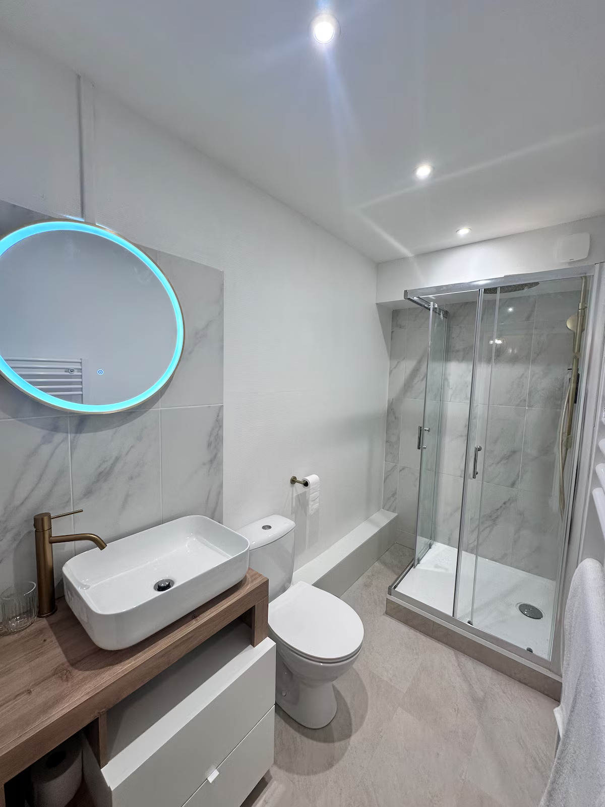 Ce projet incluait des travaux de rénovation. Une entreprise a réalisé la majeure partie des travaux mais nos clients ont activement participé à la réalisation des travaux et de la mise en place de l'ameublement pour la location.